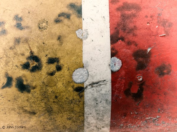 Buoys float, because they’re made of styrofoam. I was hoping that some of that buoyancy would be apparent in these pictures. With that in mind, I looked for whimsical points of view. Later, I tried to do the same with the treatments. Buoys are cone-shaped or cylindrical–about a foot tall. I decide to emphasize the curvature rather than try to fool you into thinking you’re looking at a flat plain. The curvature became most apparent with a little bit of vignetting. Most of these pictures were taken from about a foot away with a Canon G 10.