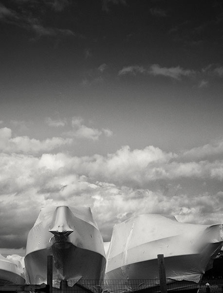 Thanks – I thought about that too because it would definitely convey something more abstract. Overall, I liked the more anthropomorphic look of paired boats eyeing the photographer as it were–and the balance provided by the two poles and the black fence at the bottom.