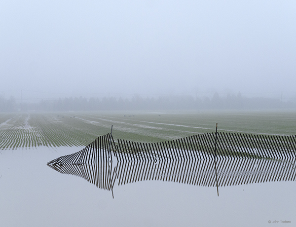 Marvelous — the lines of the fence reflected in the water and echoed in the field; the play of vertical, horizontal and diagonal lines; and a certain surprising tension in the composition. I second TramedIpensieri’s “Wow!”