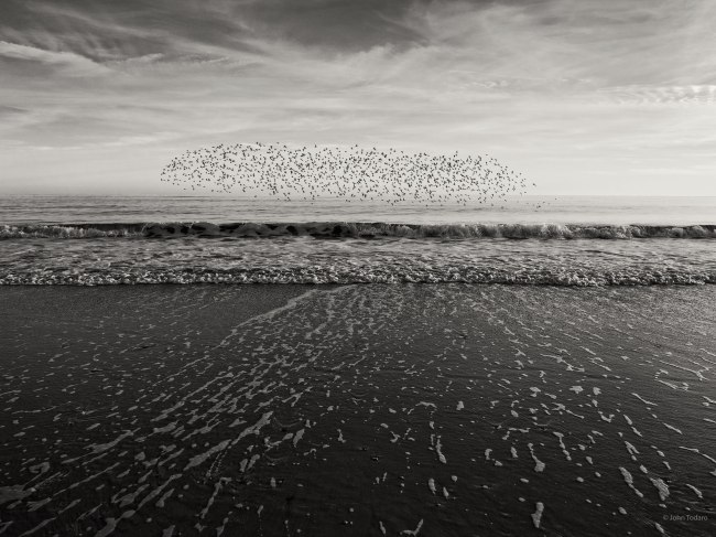 Hi Alan, there’s no digital sleight-of-hand here, only a common flock of Sanderlings “working” the shoreline. Typically they can be coaxed to fly 100′ away by a slow approach. I only got two exposures of them in flight and this one was clearly the winner.