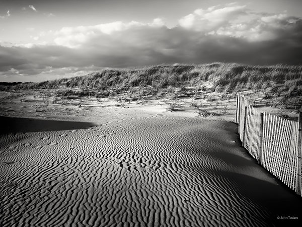The dunes and fence that could be escarpments, the strong contrasts, the sand, and the openness, all give it a southwestern feeling for me.