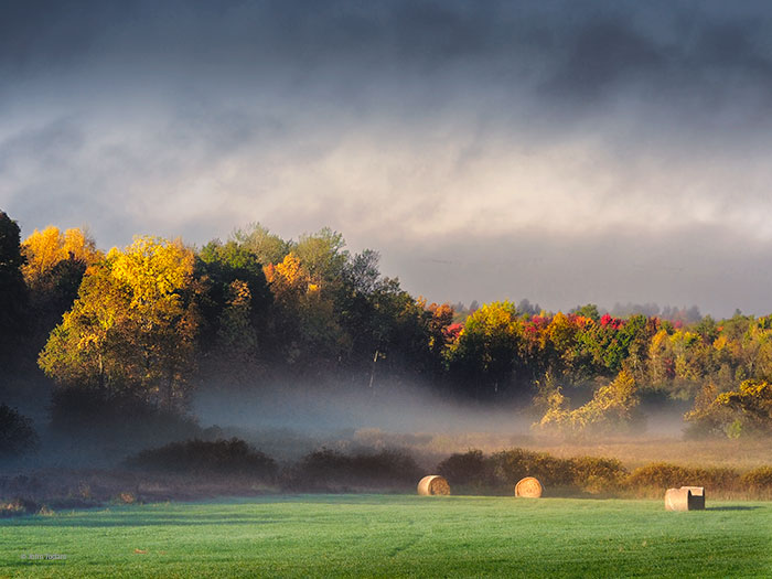 Lovely, John! So much to appreciate – the color first, then the fog, the dark sky, the solid feeling of those hay bales…