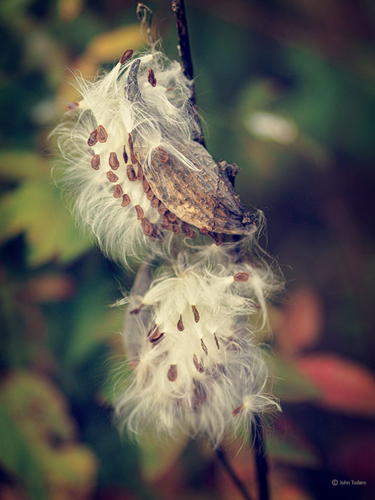More analog loveliness! Who can resist bursting milkweed pods? They look great! You rendered the seed fluff so softly without losing definition – wonderful. I could reach in and touch it.