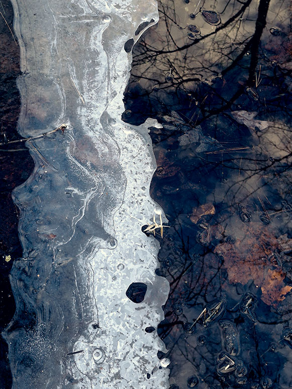 When I unpacked the second picture in the series, it looked complicated enough to come with operating instructions. You’re looking at a close-up view of ice at the edge of a pond; the last rays of sunlight skirting across the surface. Those are reflecting branches in the upper right and leaves encased in ice below. That adds up to three subject planes, if I’m counting correctly.