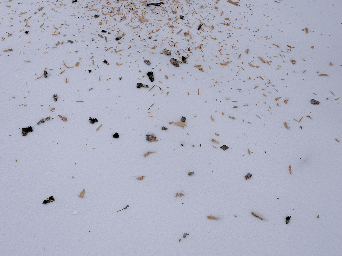 When I snowshoed past here yesterday, it occurred to me that the shavings would fit nicely into the theme. An exposure was made; one that would barely be worth noting, were it not for the circumstances.