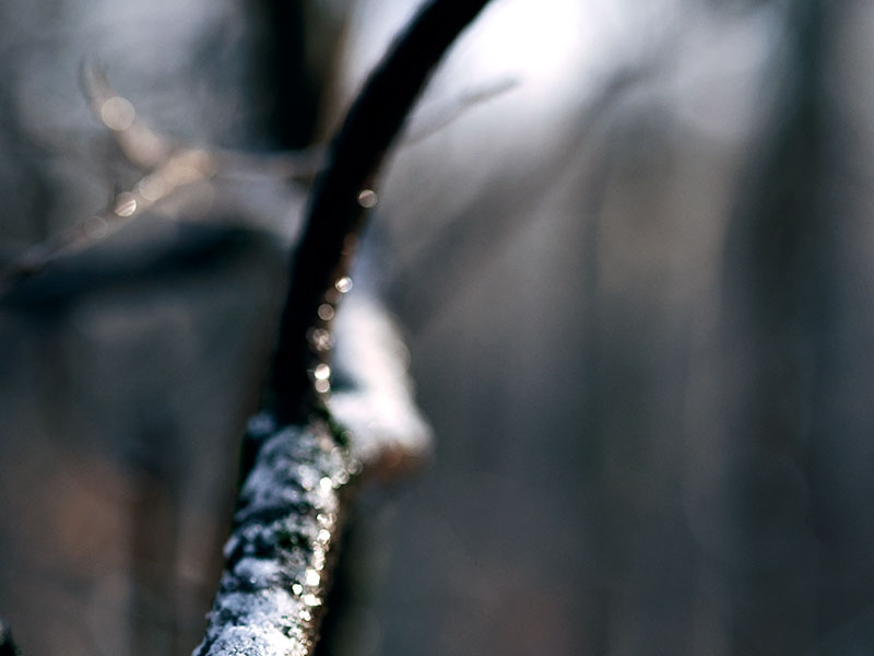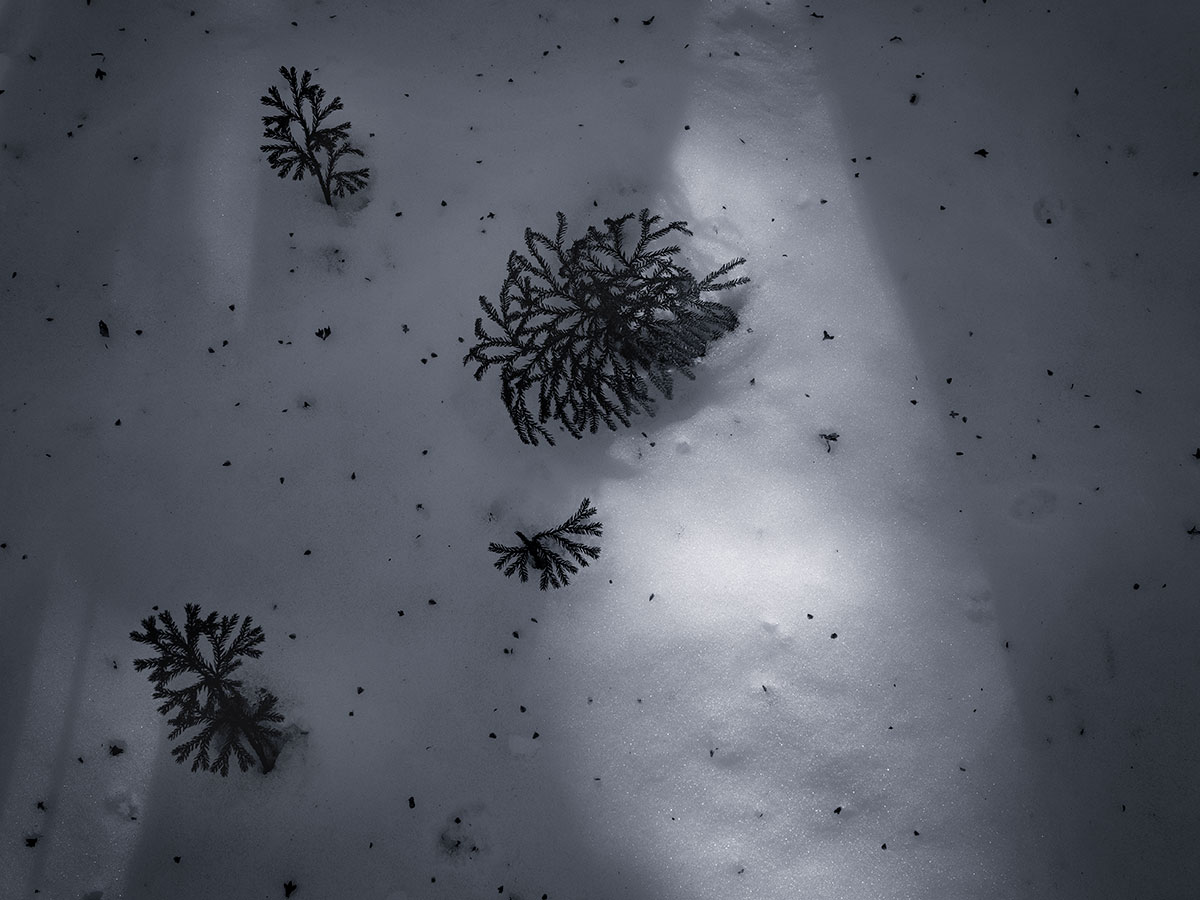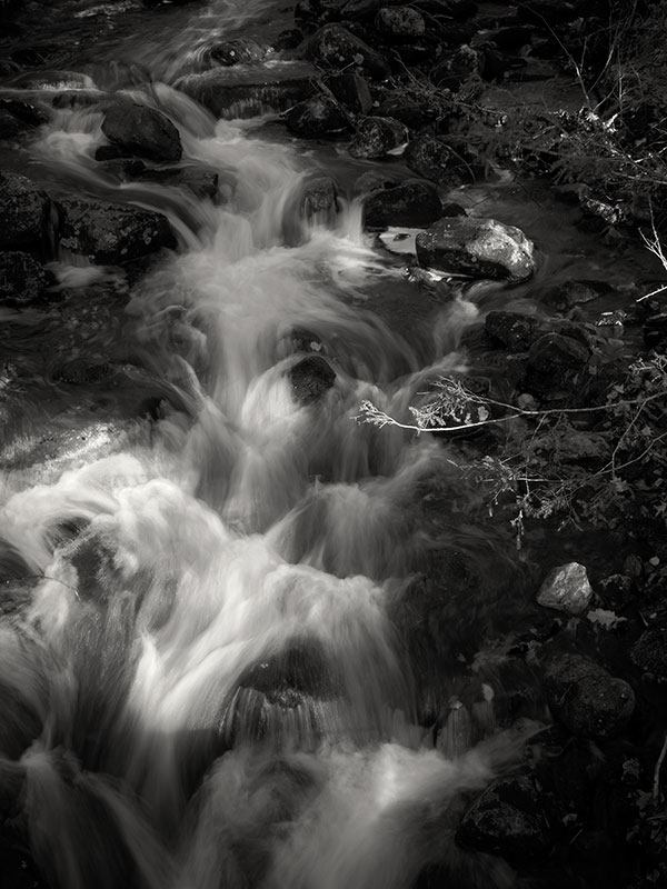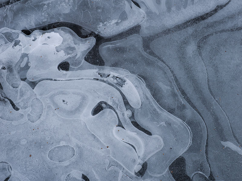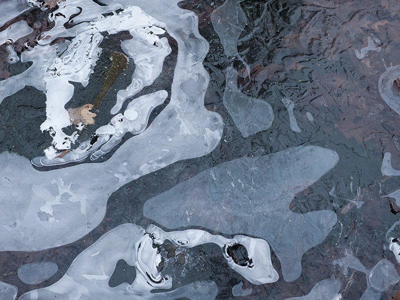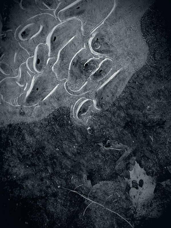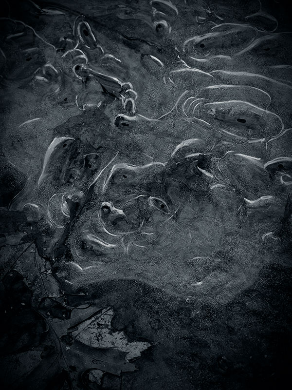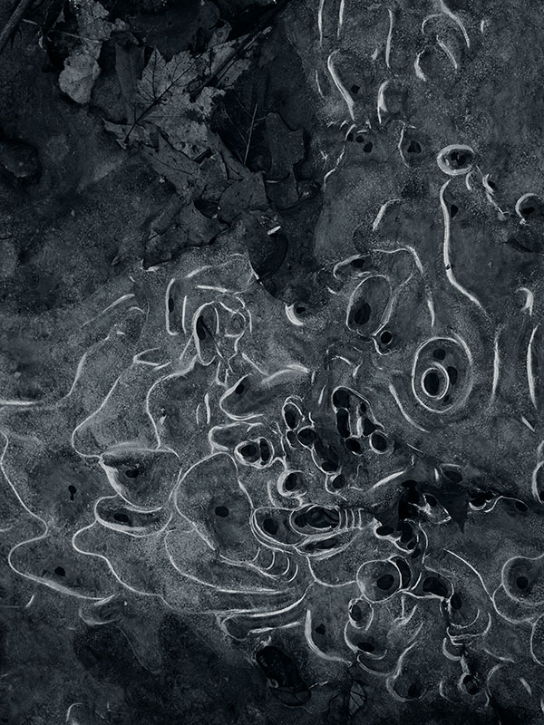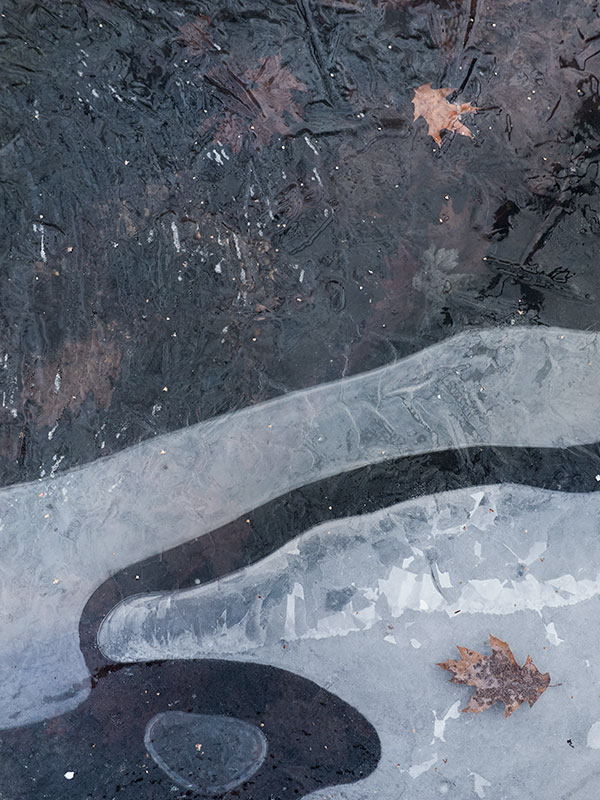 The group of cool-toned ice pictures were photographed at the intermittent stream adjacent to our home. These are black and white photographs, but since I applied a faint split-tone to each, “monochrome” wouldn’t be the right word to describe them.