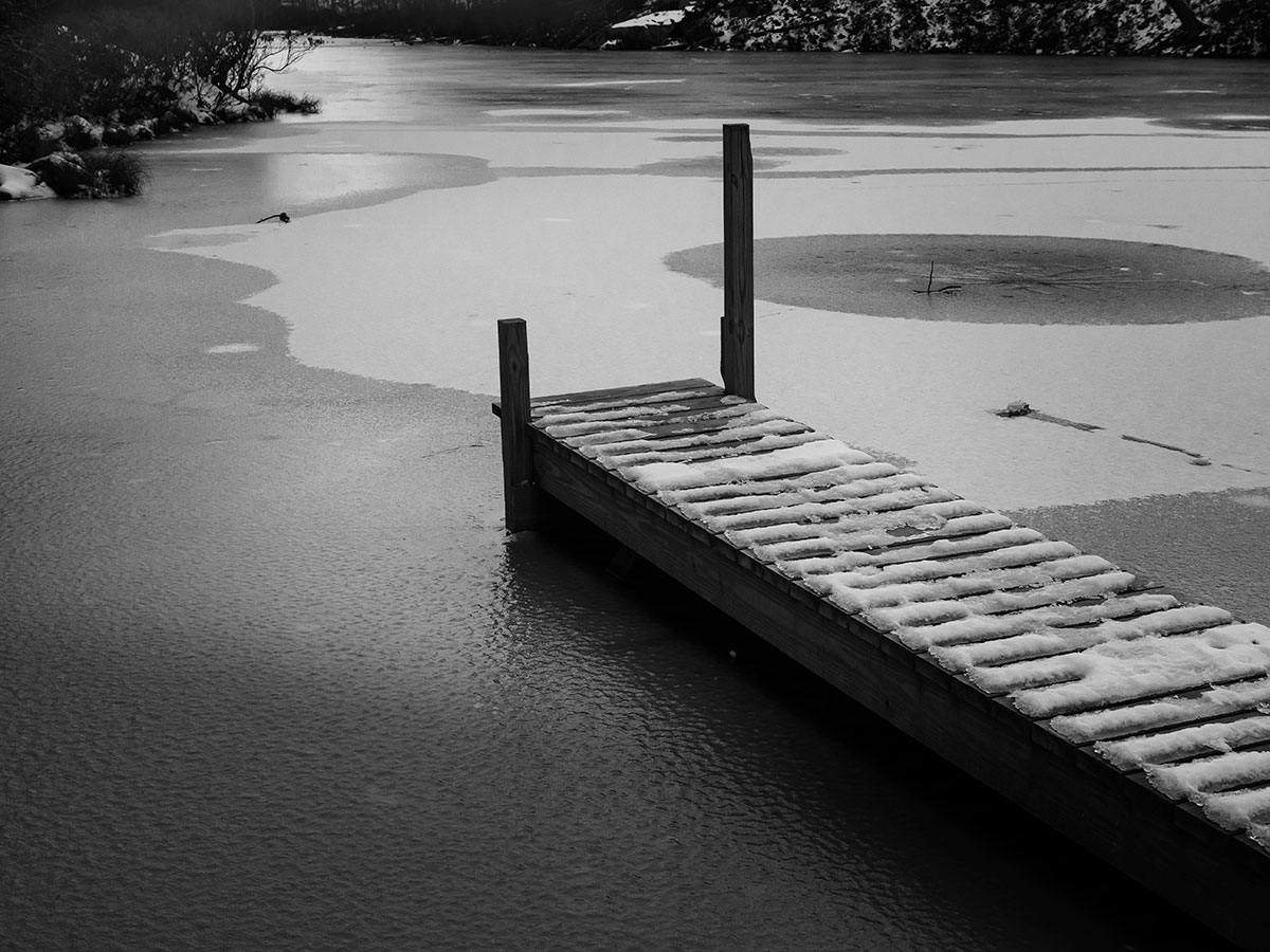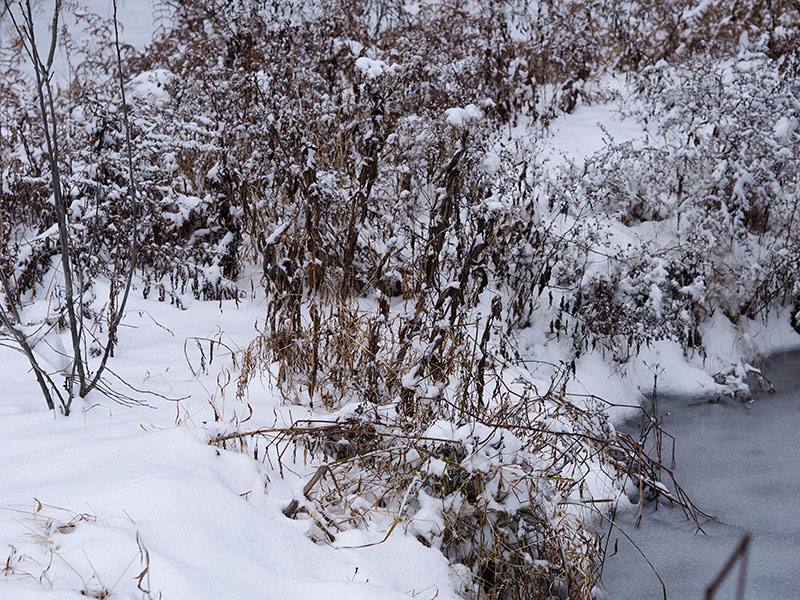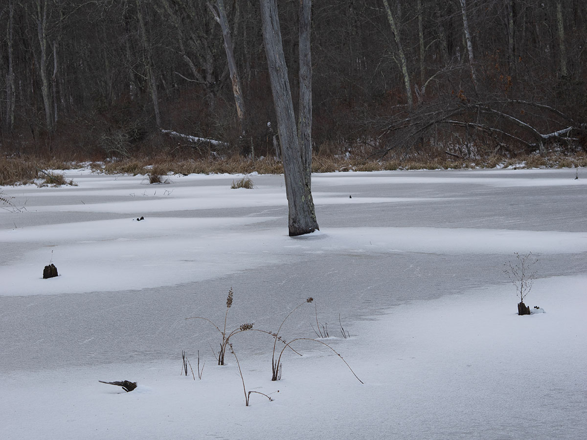 Despite temperatures well below freezing, the creek has remained in a state of partial freeze, and in various spots it can be seen pulsing below the ice. Most lakes and ponds, on the other hand, are solid enough to walk on.