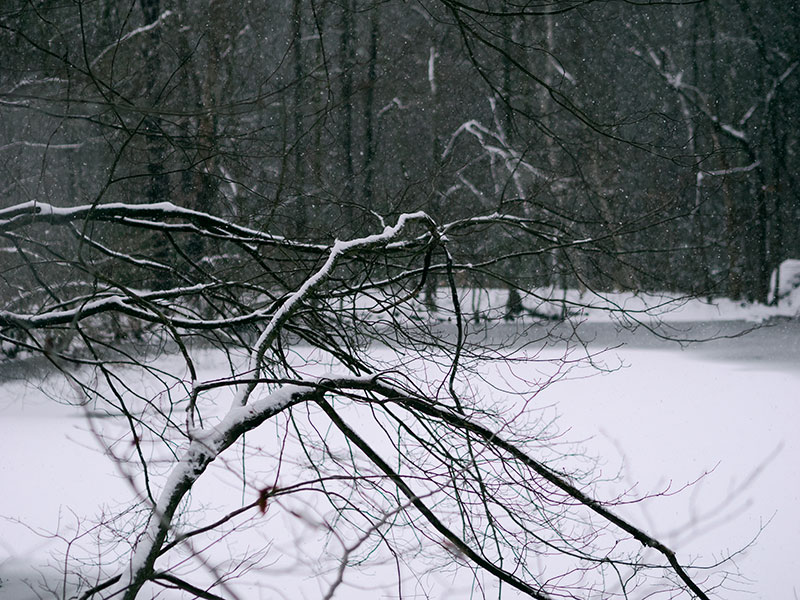 The intermittent stream next to our home that was on vacation last summer has come back to life. After the snowfall two days ago, I liked the way it looked in monochrome, especially with a pale blue tint. The stormy-light helped, I think, by reducing everything to simple shapes and contrast. This picture reminds me a bit of some of Franz Kline’s paintings.