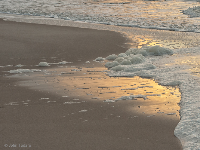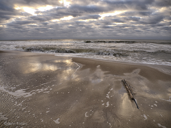 It’s been looking like this a lot lately, especially with an outgoing tide. We’ve had mercurial skies and rough water–as if the Atlantic hasn’t yet purged itself of the hurricane. We’ve also got an unusually wide sandbar with lots of driftwood littering the beach. I’ve been assuming this was created by all the sand which was washed off the dunes during the storm.