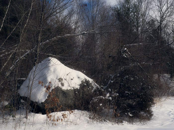 For the third group, I snowshoed into a wetland yesterday and took some pictures of the snowy hummocks that formed over the top of a creek. In the summer, this is a leafy place; a swampy maze of rocks, hemlock, maples and birch.
